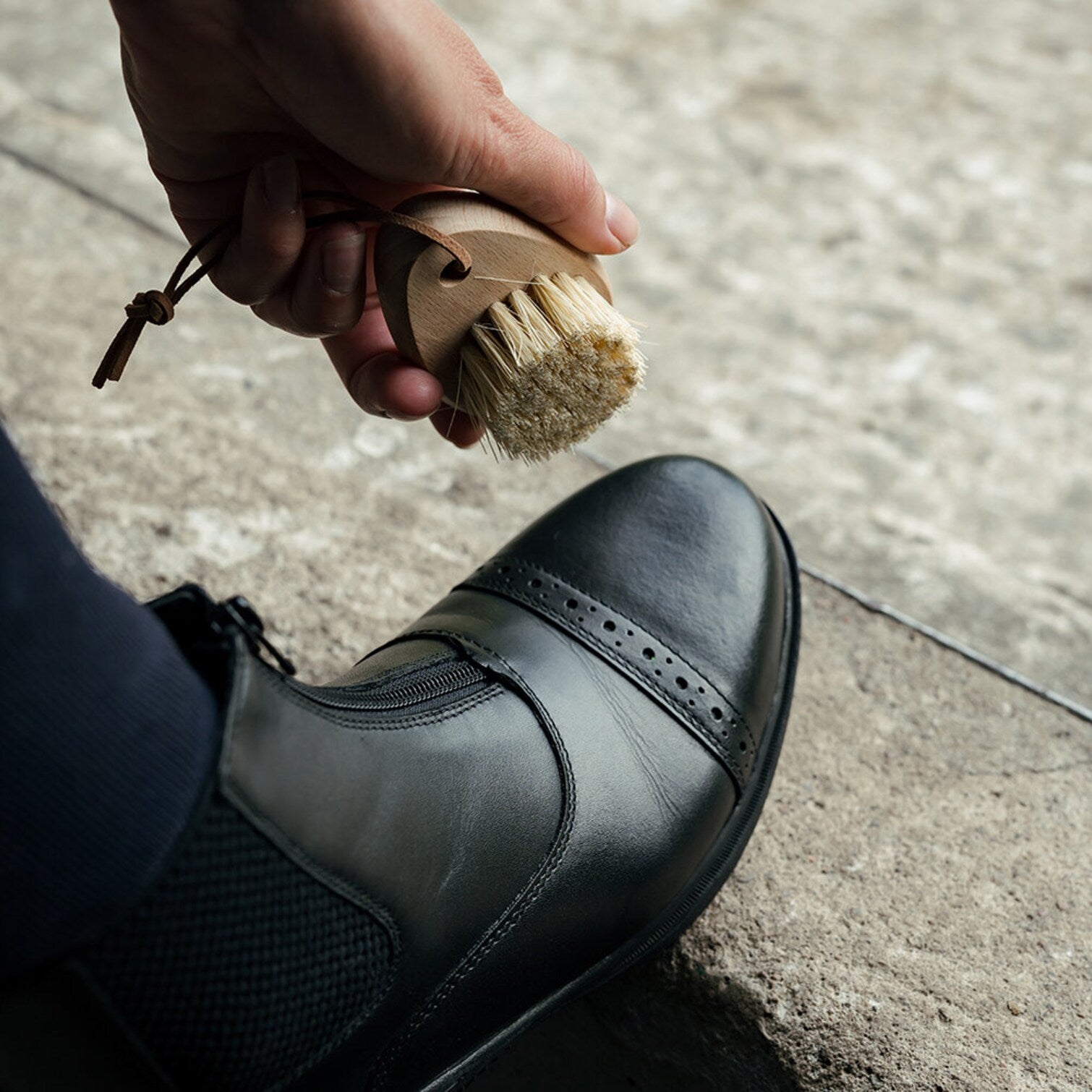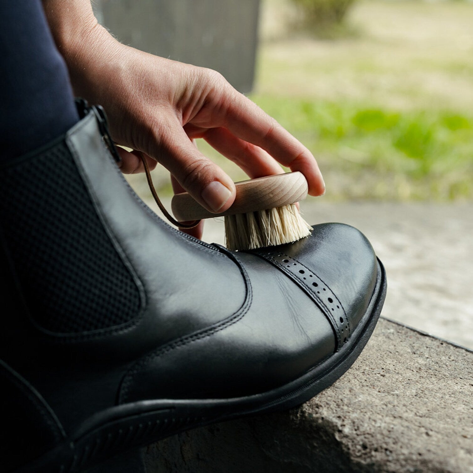 Borstiq Farm Mini sko-/støvlebørste med træryg og dekorativ læderstrop til ophængning. Et must i alle striglekasser og stævnetasker, perfekt til nemt at børste sand og snavs af støvler, stigbøjler eller hove. Børstehår af Mex-fiber.