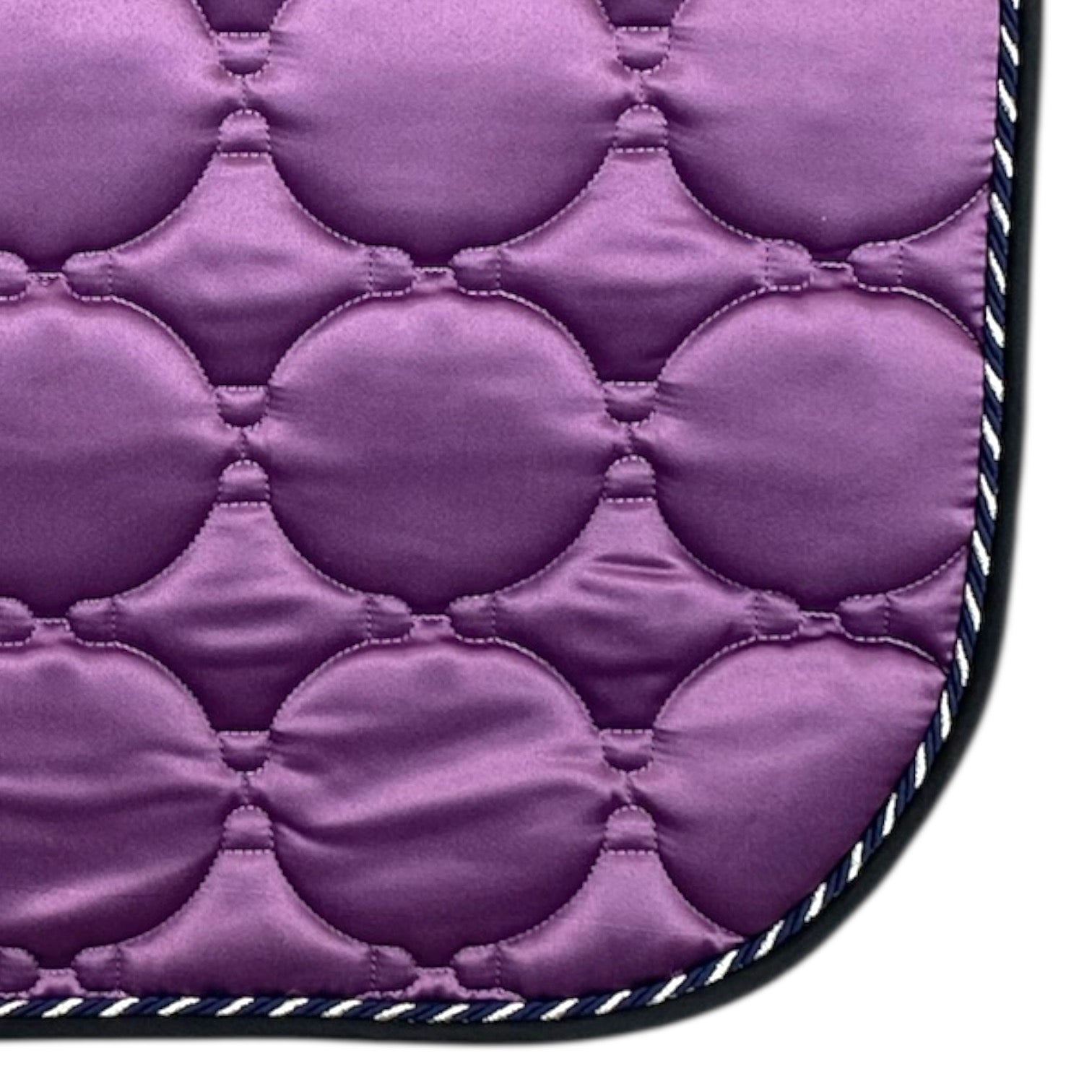 Shiny Circle dressurunderlag. Flot skinnende yderside med fin quiltning af bid og cirkler. Underlaget er uden d-ringsstropper.