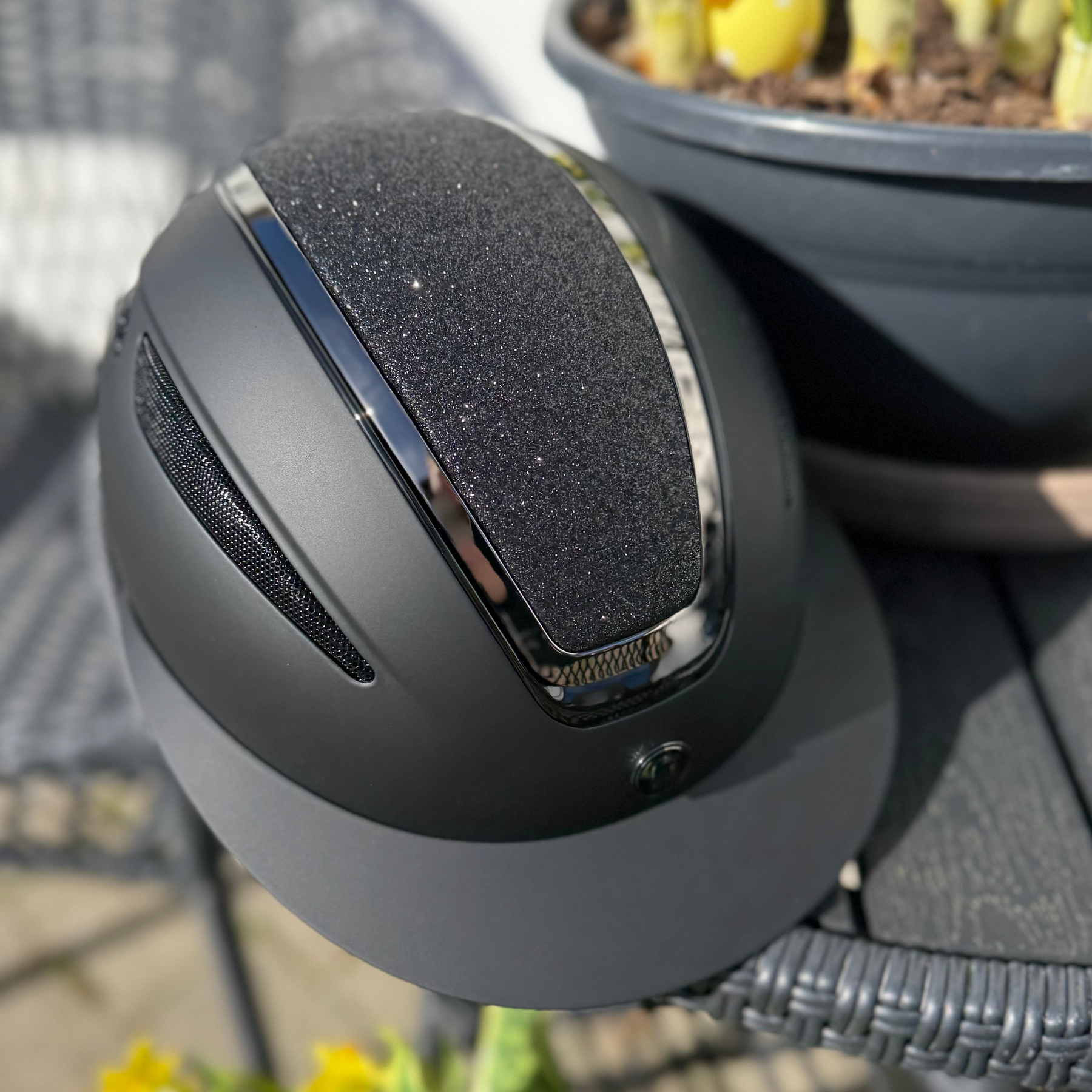 Equipage Guardian ridehjelm med elegant glittertop. Justering bagpå.