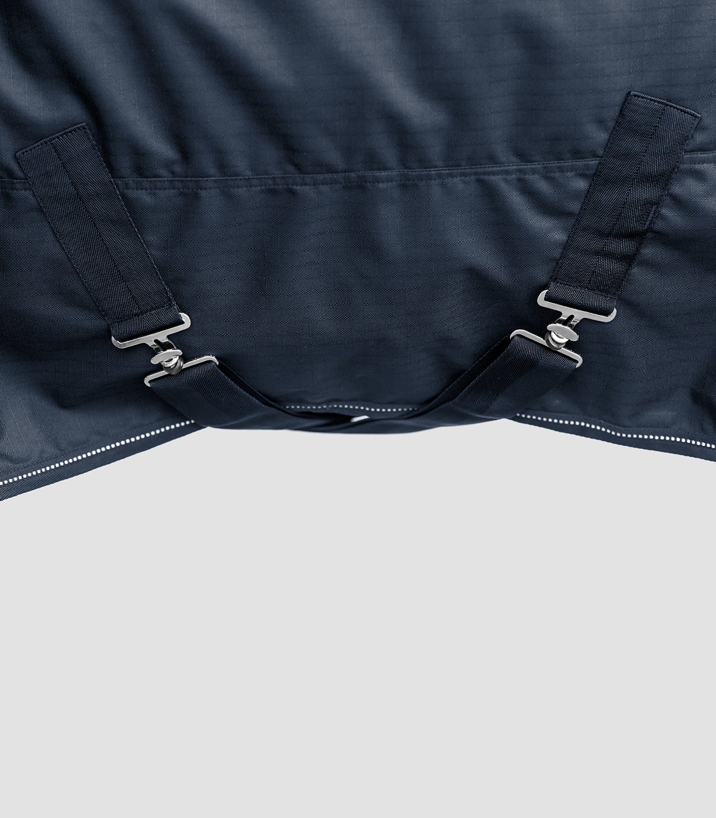 Den høje halsudskæring beskytter mankekammen og forhindrer slid, mens dobbelt T-frontlukning, krydsgjorde og bagbensstropper sikrer en perfekt pasform. Den store haleflap giver ekstra beskyttelse. Reflekterende detaljer langs kanten øger synligheden i mørke, og dækkenet leveres i en praktisk Waldhausen dækkentaske.