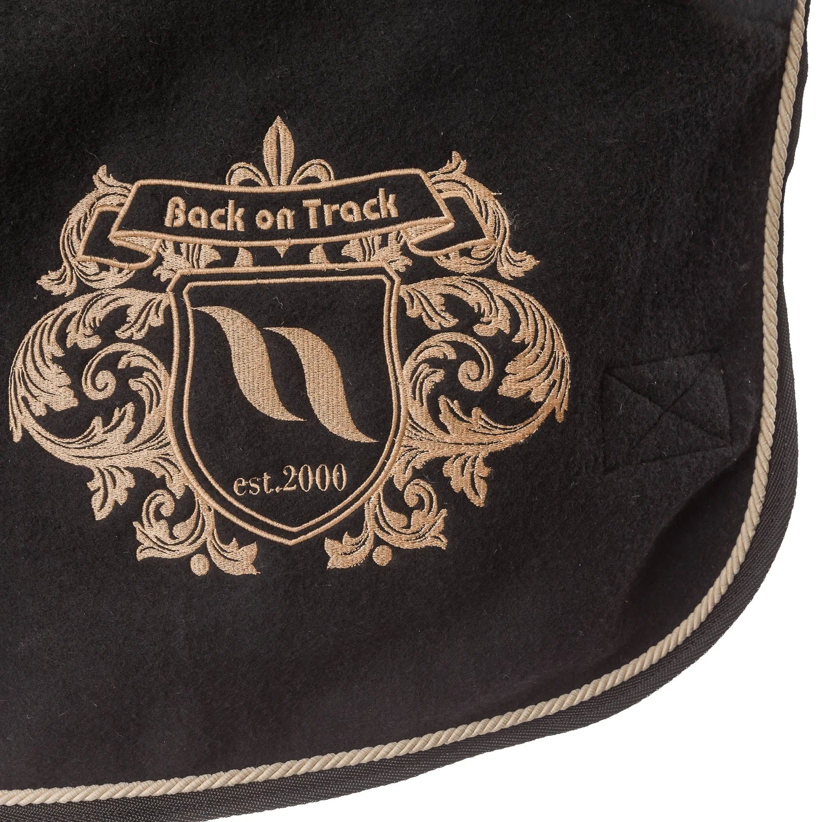 Elegant champagnefarvede kanter langs hele omslaget og et broderet logo på siden. Skridttæppet fastgøres nemt og sikkert med velcro på manken og kan bæres under eller over sadlen.