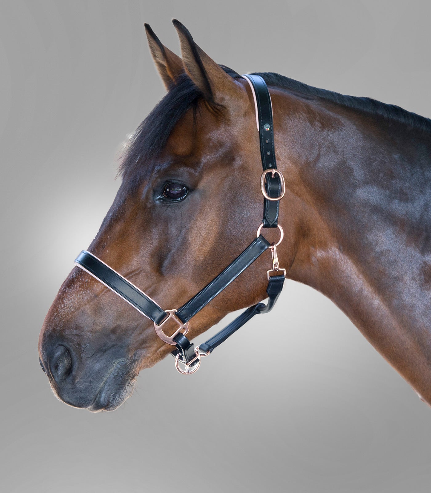 Elegant lædergrime designet i høj kvalitet med flotte detaljer. Grimen har blødt polstret næsebånd og nakkerem samt en rundsyet, elegant kæberem. De eksklusive roséfarvede spænder giver et stilfuldt udtryk.