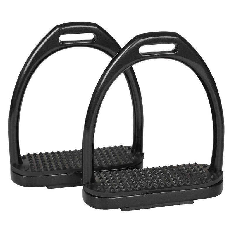 Letvægts stigbøjler i aluminium med sort trædeflade. Flot skinnende farve, der giver et moderne look til dit udstyr.