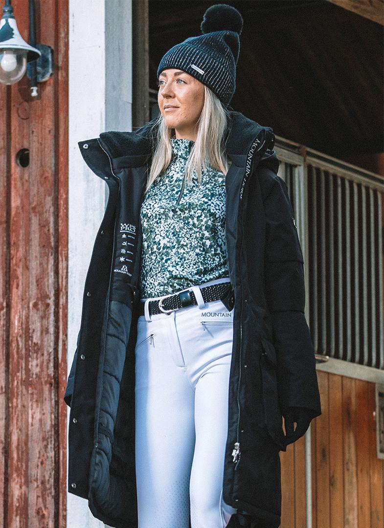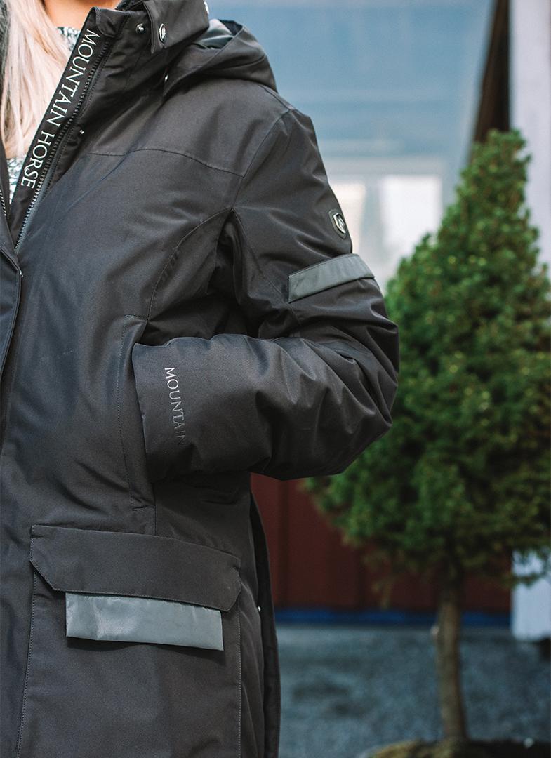 Mountain Horse Royal Saga Frakke. Funktionel, varmforet damefrakke, der både er vand- og vindtæt, designet til at give maksimal komfort i al slags vejr. Frakken er fremstillet i vand- og vindtæt W.P.S 5000-materiale med høj åndbarhed og fuldt tapede sømme, hvilket sikrer optimal beskyttelse. Den er foret med blød, tyk polyesterpolstring, der giver en fjerlet og varm fornemmelse.